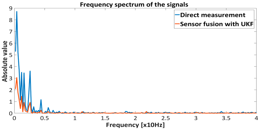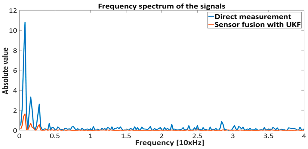 Frequency spectrum of the proximity measurements (direct measurement and sensor fusion) with Backstepping controller.