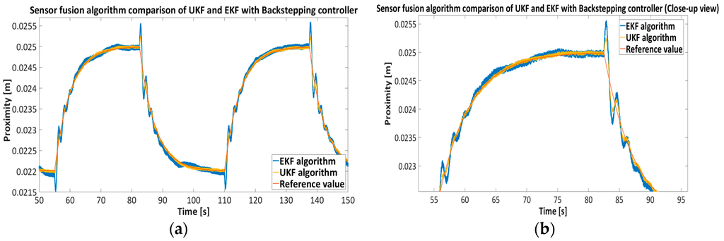 Figure 19 presents a comparison between the UKF and EKF sensor fusion algorithms with the backstepping controller given in Equation (34). The EKF algorithm uses a linear approximation (Jacobian matrix) of the model in Equation (32). For better comparison of both algorithms the span of reference value was selected between 22 mm and 25 mm.