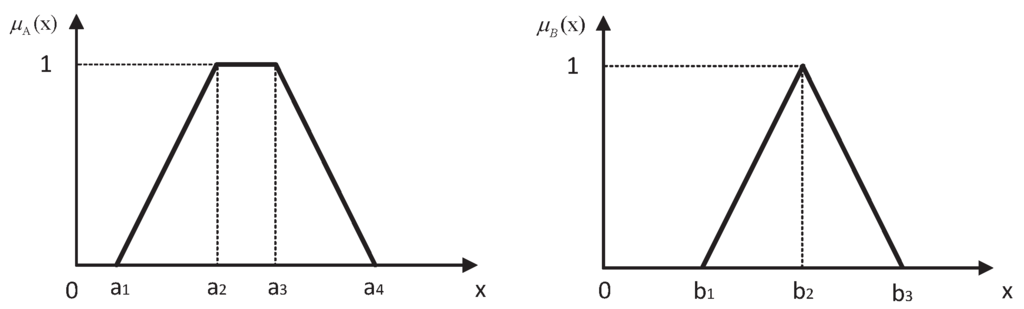 A Z-number is an ordered pair of fuzzy numbers denoted as , where A represents the fuzziness restrictions on values of the variables and B is the fuzzy reliability of the component A. The selection of the fuzzy number is often dependent on the actual application needs. For simplicity, A and B are usually assumed to be trapezoidal or triangle fuzzy numbers, and the membership functions of them are depicted in Figure 1. The membership function of A, , may be elicited by asking a succession of questions of the form: To what degree does the number, a, fit your perception of A? Example: To what degree does 50 min fit your perception of about 45 min? Additionally, B can be interpreted as a response to the question: How sure are you about your answer? In real life, much of everyday reasoning and decision-making is based on a collection of Z-valuations. Some simple examples of Z-valuation can be expressed as follows: