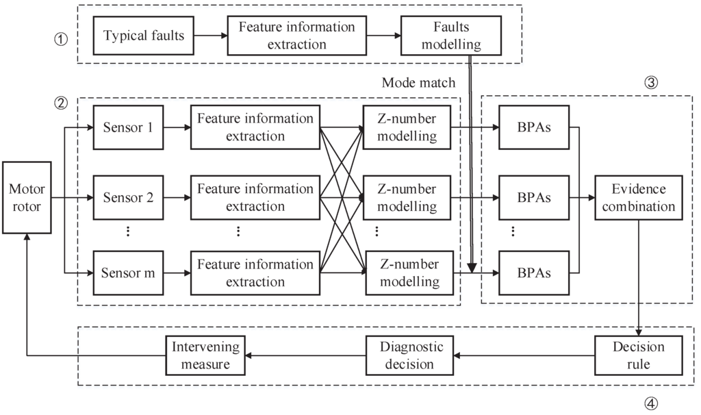 To address the above issues, we propose a new sensor data fusion method based on Z-numbers and D-S evidence theory. The concept of Z-number proposed by Zadeh [] in 2011 is an ordered pair fuzzy numbers denoted by . The first component A is a fuzzy restriction on a value of the variable X. The second component B represents a measure of the certainty or reliability of the A. A Z-number can take both the fuzziness and the reliability into consideration, which is just suitable for modeling sensor data. In this paper, we propose a data-driven method to dynamically produce Z-numbers. The fuzzy reliability, which is obtained from the original feature information, can reduce the information lost. Based on the proposed Z-number model, we conjunctively apply the evidence theory [,] and the Z-number [] to evidence the combination in fault diagnosis. D-S evidence theory [,] can establish the relationship between the set and the proposition of fault and is widely used for sensor data fusion in fault diagnosis. For example, for a discernment frame {unbalance, misalignment, the base loose, rotor bending}, uncertain information can be described as “the rotor fault has a belief degree of 70% belonging to the set A = {unbalanced, base loose} and has a belief of 30% belonging to set B = {rotor bending, misalignment}”. By mode matching, we make use of the component A of a Z-number to get BPA. The second component, the fuzzy reliability, as a measurement of the reliability of the sensor, can be used to modify the BPA. By fusing the multi-sensor and multi-feature information, the synthesized evidence is obtained for fault diagnosis according to the defined diagnostic rules.