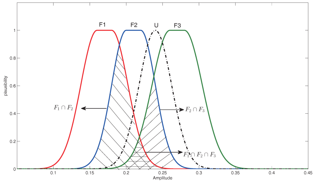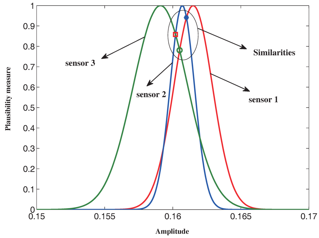 Actually, not just the method of modeling and processing is uncertain, but also, the measure of the reliability of information source influences the fusion results. While most of the fusion systems optimistically assume that the information sources are all reliable and pay more attention to uncertainty modeling and fusion methods, however, the performance of the fusion system highly depends on the sensor performance, including accuracy, work efficiency and the ability to understand the dynamic working environment []. Therefore, the procedure to estimate the reliability of each sensor is indispensable. In evidence theory, discounting factors were introduced by Shafer [] to account for the reliability of the information sources. Originally, the discounting factors were defined to discount the belief functions. Later, the sensor discounting factor was introduced in [] to represent the sensor reliability. Now, we can find more researchers who employ the discounting factor method to measure the reliability of the multi-source information. For example, in [], a novel belief entropy [] was applied to measure the information volume of the evidence. Then, the discounting coefficients based on this belief entropy, as the reliability of each evidence, are calculated to deal with the evidence conflicts in the application of evidence theory. In [], Guo et al. presented a framework for sensor reliability evaluation in classification problems based on evidence theory. In their work, static reliability and dynamic reliability were taken into account in the evaluation process, where a static discounting factor assigned to a sensor was based on the comparison of its original readings and the actual values of data, and the dynamic discounting factor was obtained by adaptive learning and regulation in real-time situations. Similarly, the statistic sensor reliability and dynamic sensor reliability were also taken into consideration in []. Being different from [], the static reliability in [] was obtained from the evidence sufficiency and evidence importance propose by Fan and Zuo [], and the dynamic reliability was generated based on the evidence distance function [] and the belief entropy []. This method can be used for conflict management [,,,] in D-S evidence theory, as well. Although the discounting factors’ method performs well in some cases, some aspects can be improved to measure the reliability of the sensors more reasonably. Sensor reliability is related to the context of sensor acquisitions. The external factors, such as environmental noises, deceptive behaviors of observed targets, meteorological conditions, and so forth, often affect the performance of the sensors. Therefore, sensor reliability cannot be easily and accurately measured. In other words, a crisp discounting number cannot completely cover the whole complexity and fuzziness of the sensor reliability. Therefore, we deem that it will be more reasonable to model the fuzzy reliability of a sensor. In addition, the existing methods [,,,] usually excavate the discounting factors from BPA, which has lost part of the source information; as a result, the obtained discounting factor may not reflect the real situation well.