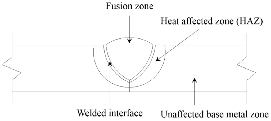 Structural health monitoring (SHM) has received much attention in recent years due to past catastrophic incidents involving civil infrastructures, which led to severe economic losses and casualties. To prevent and predict such catastrophic failures of civil infrastructures, local SHM techniques for early detection of incipient damage have been widely studied [1,2,3,4]. Although a number of local SHM techniques have been proposed, their application to in-situ civil infrastructures is still challenging due to the structural boundary complexity and harsh environmental conditions. In particular, welded area monitoring is important, but difficult to realize. Because the welding process-caused heat affected zone (HAZ) of the welded area is one of the structurally weakest areas [4,5], incipient cracks are often initiated from the HAZ due to excessive stress concentration even under yield stresses. After the heating process up to the melting temperature of the welding metal, shrinkage phenomena typically occur during the cooling process. Such shrinkage phenomena cause distortions in the longitudinal and circumferential directions and eventually lead to residual stresses due to the constraint boundary conditions, as shown in Figure 1. The fusion zone represents the welded area obtained with a welding rod. Between the fusion zone and HAZ, a welded interface exists. The other area where is not affected by the welding process is called the unaffected base metal zone. Once the structure is exposed to external loads, the residual stresses become one of the critical contributors to crack initiation in HAZ.