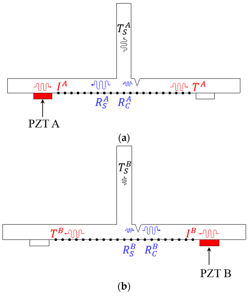 Schematics of Lamb wave generation and measurement: (a) generated from PZT A and (b) generated from PZT B. Superscripts A and B represent Lamb wave excited from PZT A and PZT B, respectively.