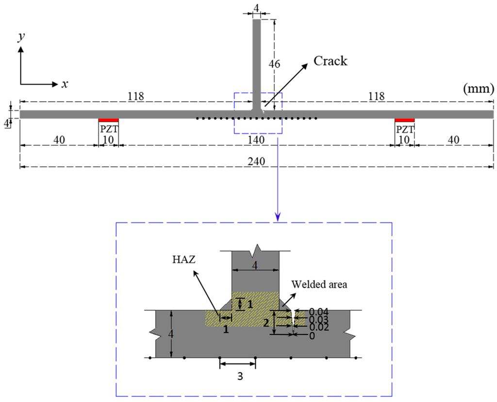 2D plane strain model with a vertical stiffener: The PZTs with a dimension of 10 × 0.508 mm2 are modeled on the opposite surface to the vertical stiffener for Lamb wave generation. The depth of the crack is 2 mm and its width is varying from 0 to 40 μm along the through-the-thickness direction at HAZ.