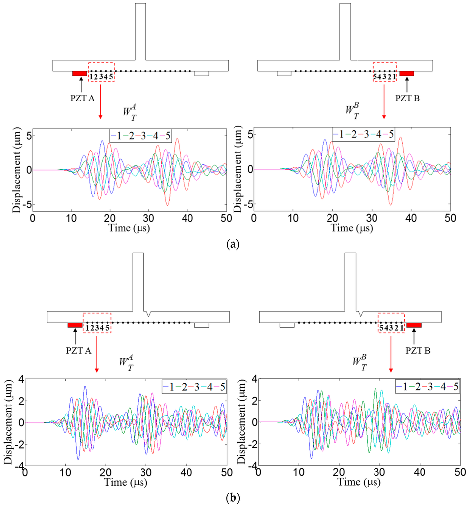 Figure 5 shows the representative and obtained from the intact and crack models at 150 kHz. As expected, and are exactly same in the intact case of Figure 5a, meaning that the dynamic reciprocity is retained. On the other hand, the crack-caused signal difference between and is clearly observed in Figure 5b.