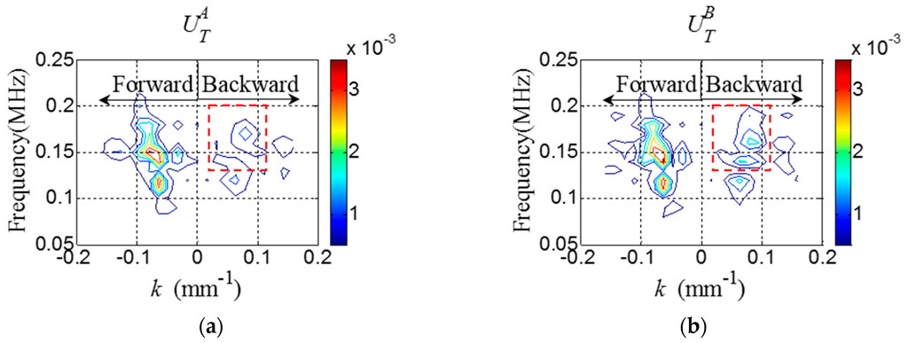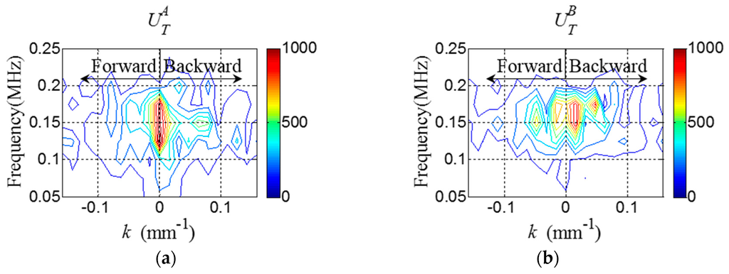 Once and are obtained at all spatial sensing nodes of interest, the f-k domain plots can be obtained using Equations (1) and (2). Figure 6 shows the representative f-k domain plots of the crack model at 150 kHz. The crack-induced difference between and in the backward wavefiled area of the f-k domain plots is more clearly observed in Figure 6. From the f-k domain data, and are computed as 1.2 × 10−15 and 1.37 × 10−15, respectively, indicating that crack location is the PZT B side with respect to the stiffener. This diagnosis result shows the good agreement with the actual crack location as shown in Figure 5b.