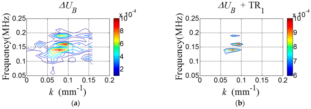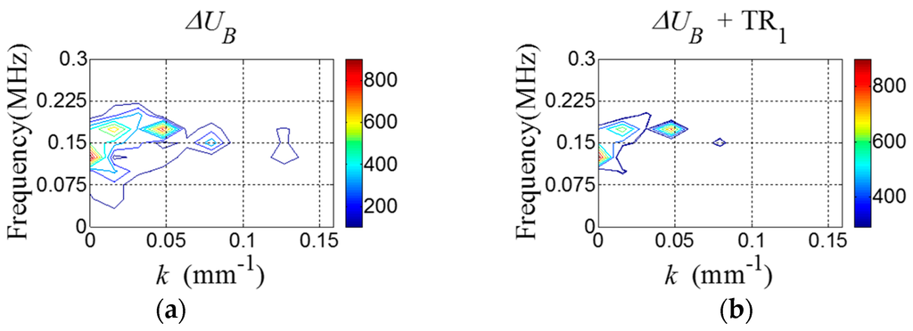 Once and are obtained from the target structure, the f-k domain analysis is subsequently carried out. Figure 14 shows the representative f-k domain plots of and obtained from the cracked area of the specimen at 150 kHz. The crack-induced difference between and can be observed in Figure 14, and caused by the crack is more clearly shown in Figure 15. Similarly, and are computed as 1.95 × 10−4 and 2.1 × 10−4, respectively, indicating that crack location is the PZT B side with respect to the stiffener.