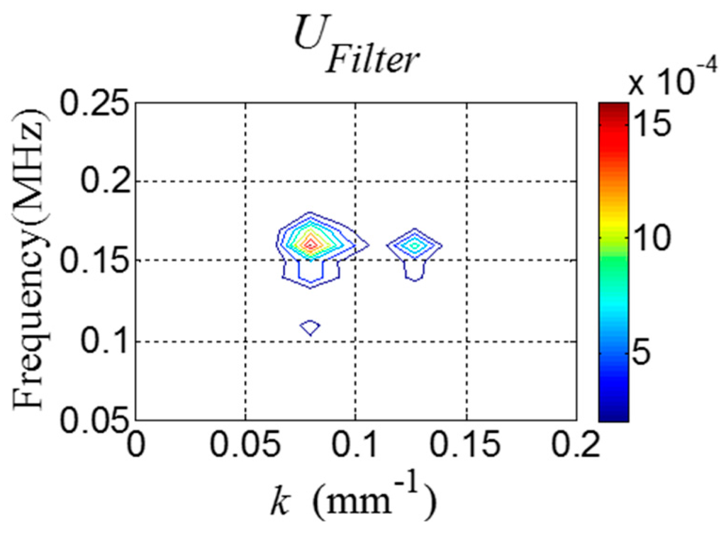 - Ruzzene, M. Frequency-wavenumber domain filtering for improved damage visualization. Smart Mater. Struct. 2007, 16, 2116. [Google Scholar] [CrossRef]
