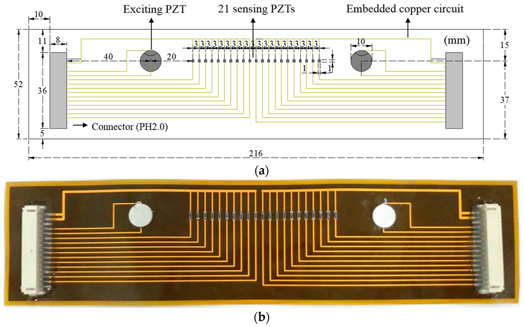 To experimentally validate the proposed technique, the stripe-PZT sensor is developed as shown in Figure 11. The stripe-PZT sensor enables to simultaneously generate Lamb waves and measure and without additional sensor installation. Figure 11a shows that the stripe-PZT sensor consists of the two circular excitation PZTs, 21 sensing PZTs with the spatial interval of 3 mm, and two connectors (PH 2.0) for users’ convenience. All components are sophisticatedly embedded onto flexible printed circuit board (PCB) as shown in Figure 11 so that the stripe-PZT sensor can be applied to curved surfaces. The actual stripe-PZT sensor is displayed in Figure 11b.