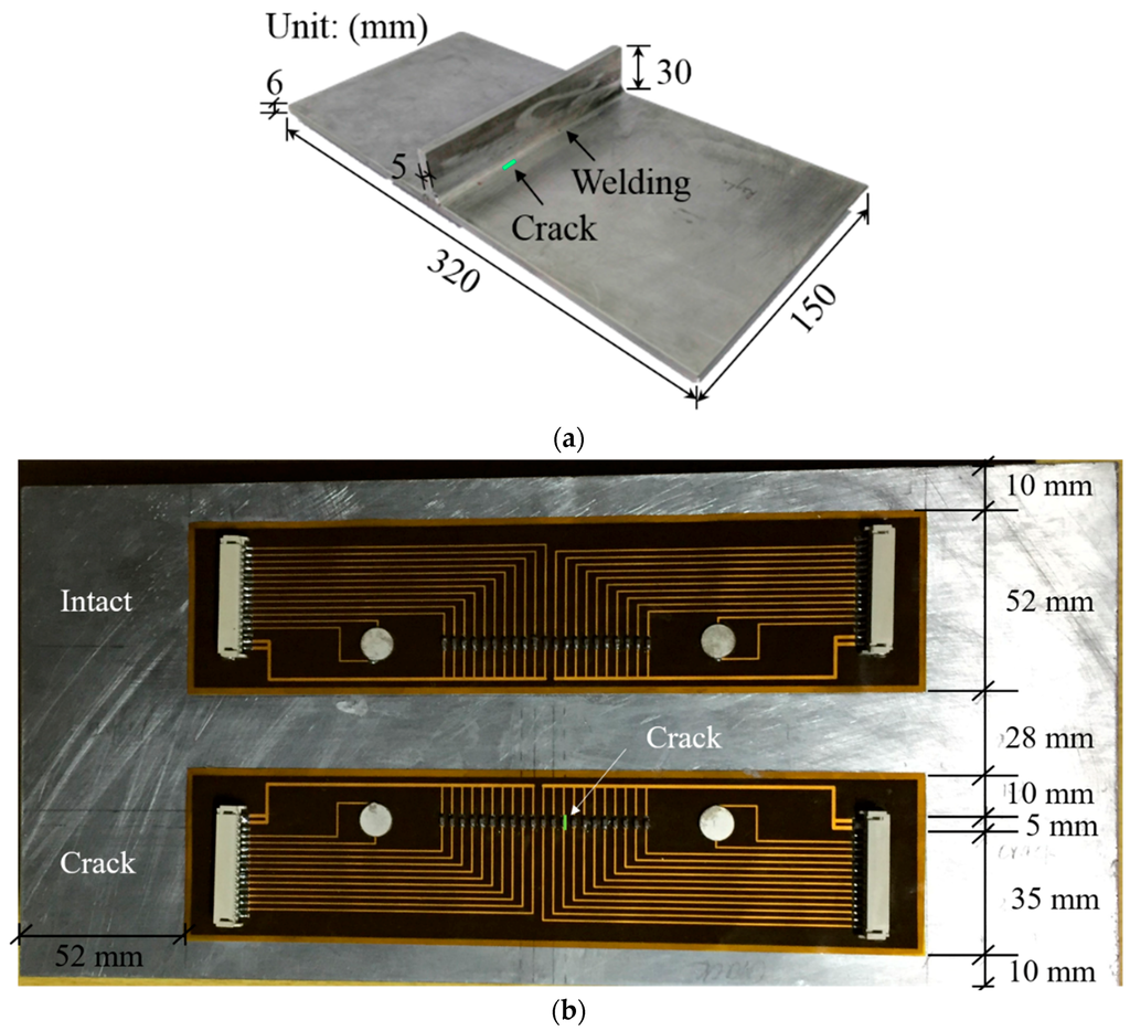 The target structure for experimental validation is an A6061 aluminum plate with a vertical stiffener as shown in Figure 12a. The vertically stiffened aluminum plate is manufactured by welding the stiffener to the plate. Then, an artificial notch with a dimension of 5 × 1 × 3 mm3 is introduced at HAZ as shown in Figure 12a. It has been reported that a notch can properly represent an open crack if the notch width is trivial compared to the smallest wavelength of the measured Lamb waves [25]. In particular, the crack is made at the HAZ area 50 mm apart from the end boundary along the stiffener because both intact and crack areas can be tested using the same specimen as shown in Figure 12b. Two stripe-PZT sensors are installed on the opposite surface of the crack and stiffener as displayed in Figure 12b. The upper one crosses only the welded stiffener, and the lower one covers both the crack and the stiffener.