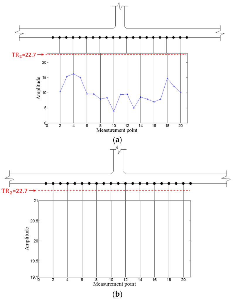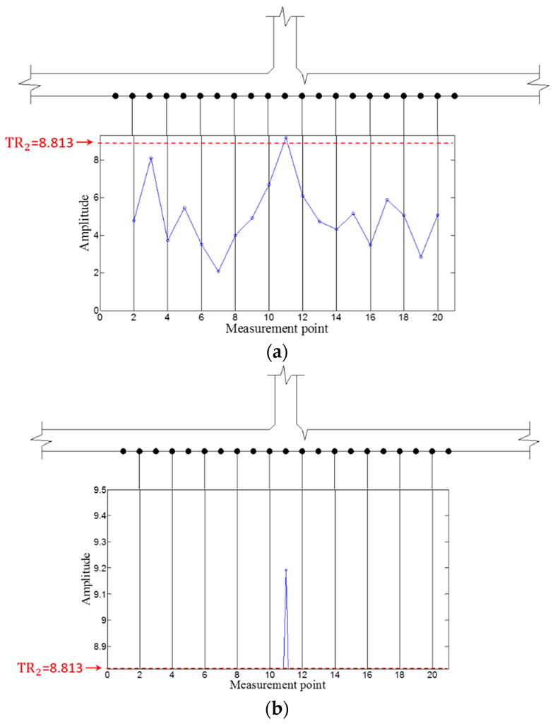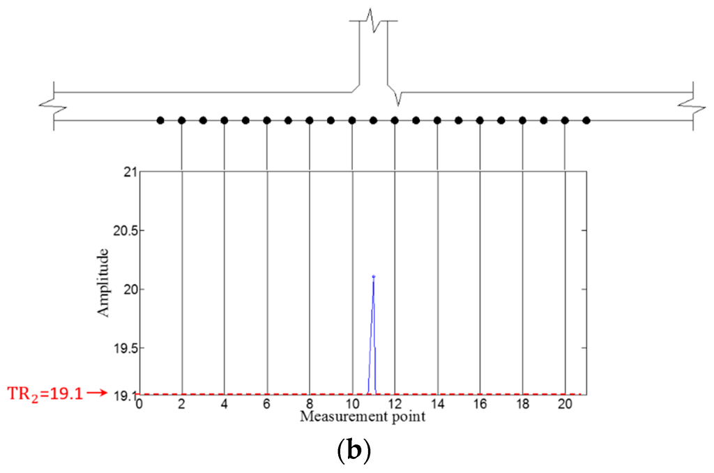 Although physically contains both and , is typically much larger than due to higher reflectivity of the crack than the stiffener. Based on the phenomenon, a threshold value (TR1) with respect to a one-sided 99% confidence interval is calculated to highlight and to minimize in .