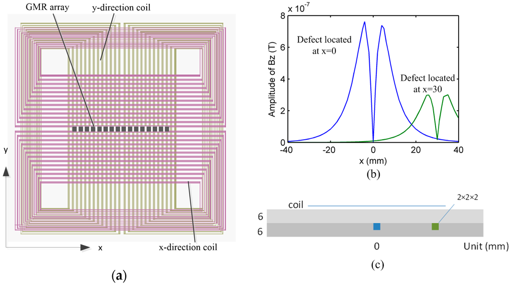 (a) Top view of orthogonal coils and linear array sensors; (b) Simulation result of response signals due to defect located at x = 0 mm and x = 30 mm; (c) Lateral view of the model.