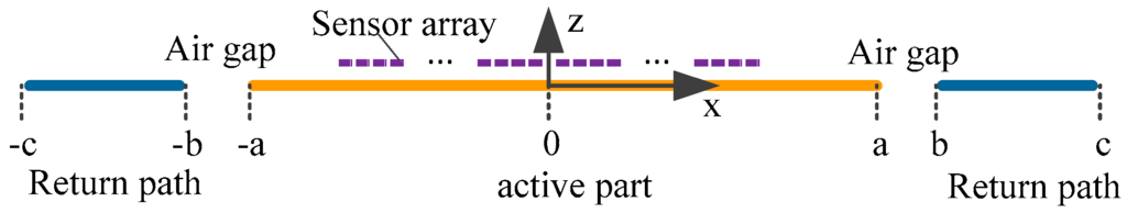 In order to address the problems described above and improve the performance of the probe, the excitation coil design is optimized to make the excitation field uniform across the sensor array. The lateral view of the y-direction excitation coil and the sensor array is shown in Figure 2. The coil consists of the active region with excitation current and return paths. The active part is defined by while the return paths lie in the interval , here 0 < a < b < c.