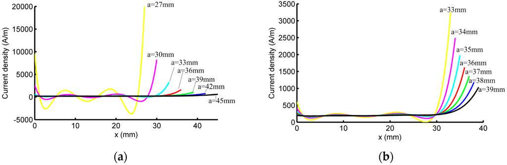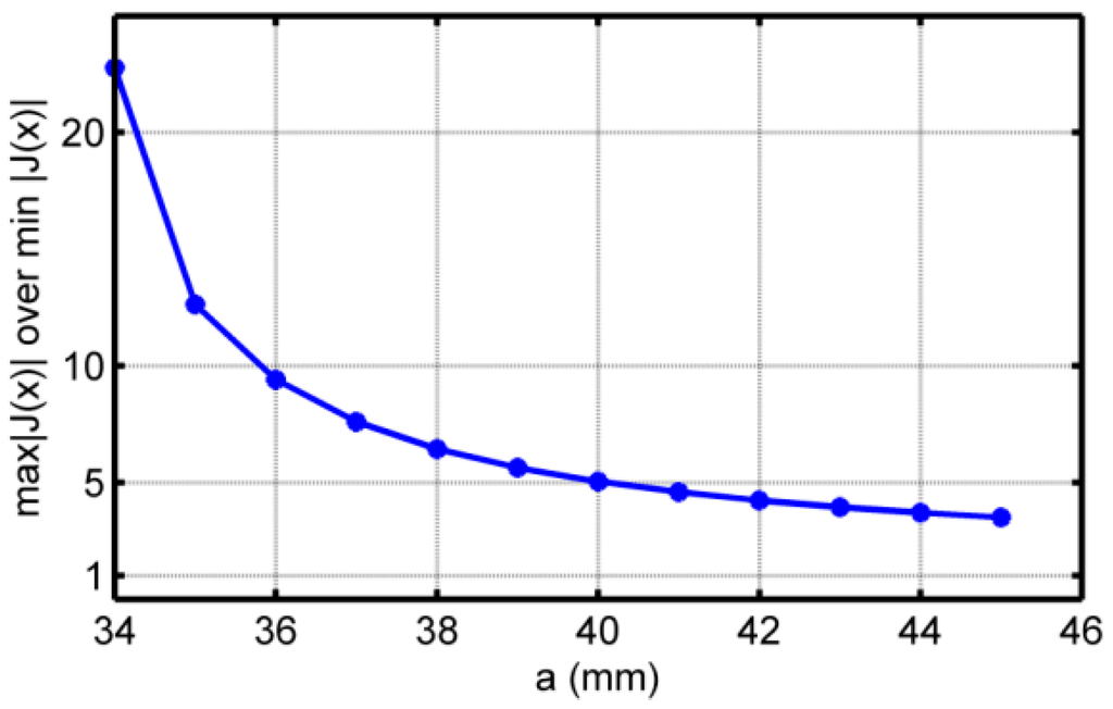 The effect of “a” is studied numerically by sweeping parameter “a” from 25 mm to 50 mm at increments of 1 mm. For each value of “a”, “b” and “c” are calculated according to Equations (18) and (19), is calculated from Equations (9) and (15) is analyzed. It is found that Equation (15) is not consistent when a ≤ 26 mm. When a ≥ 27 mm, a non-zero solution of P is derived from Equation (15) from which is calculated using Equation (3). Some of these plots of are presented in Figure 3a. It is seen that the plot of oscillates between positive and negative values when a ≤ 32 mm. So “a” should be no less than 33 mm, which is reasonable considering that the sensor array is located at . Figure 3b presents the optimized current density distribution when 33 ≤ a ≤ 39, in which case is always positive.