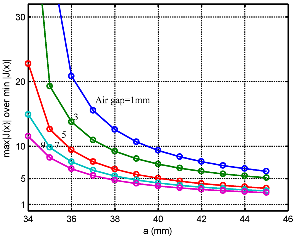 The effect of the width of the air gap between the active region and the return path () is studied in this section. is varied from 1 mm to 9 mm at increments of 1 mm. The value of defined in Equation (20) is calculated for different values of . The plots of vs. “a” for different values of are presented in Figure 5.