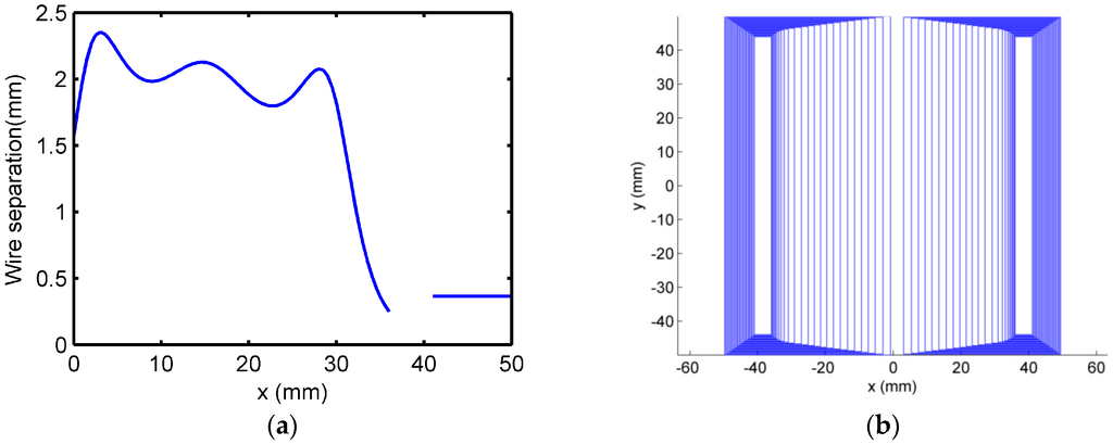 Here Equation (1) is due to the symmetric structure of the coil. The current density distribution is an even function of x and hence it is necessary to optimize only . Equation (2) indicates that the total return current is equal to the total excitation current for each half of the coil to satisfy the current continuity theorem.