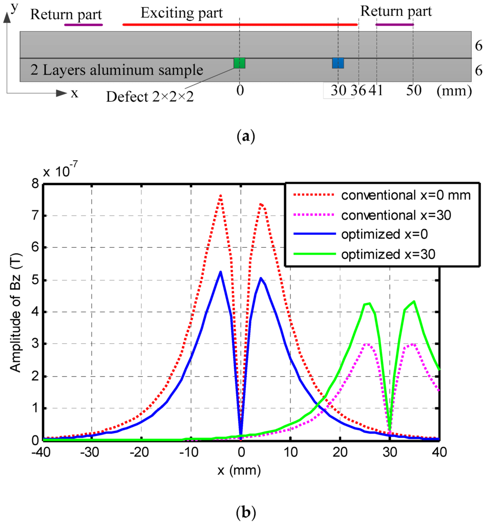 (a) Lateral view of tested sample and excitation coil; (b) Simulation results of the optimized coil and uniform distribution coil for a defect located at x = 0 mm and x = 30 mm after background subtraction.