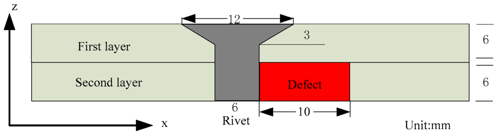 Next, defect and fastener geometry is modeled using the finite element model. The test specimen is a two-layered aluminum structure as shown in Figure 9. A radial notch spans the thickness of the second layer. Rotating current excitation with two identical orthogonal coils is used in these simulations. The excitation frequency is 100 Hz and current amplitude is 1 A. The orthogonal coils are located at a 1 mm liftoff from the top surface of the test sample. A C-scan image is produced by calculating the normal component of the magnetic field () values at a 1 mm liftoff distance from the coils at each scan point. To highlight the rivet and defect signal, the background signal obtained by placing the coils on top of defect free aluminum sample is subtracted from the measured signal.