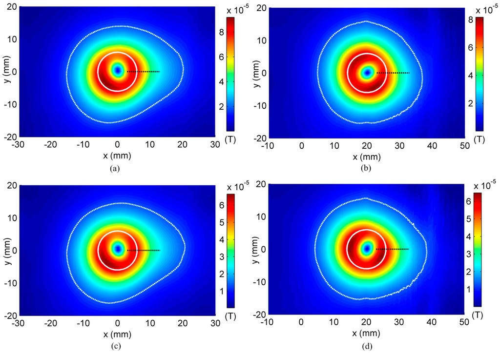 The performance of the optimized probe is compared with that of a conventional coil for the cases of the rivet located at x = 20 mm off the coils’ center. A defect free aluminum fastener and a fastener with a 6 mm length defect in the second layer are scanned. The experimental results are presented in Figure 14, in which the contour selected at 30% of the maximum value in the image is plotted. Theoretically, the image of the defect free rivet should be circular [12], as seen in Figure 14a. However, it is seen from Figure 14b that the image of the defect free rivet generated using the conventional coil is distorted due to the non-uniform distribution of the excitation field and eddy currents.
