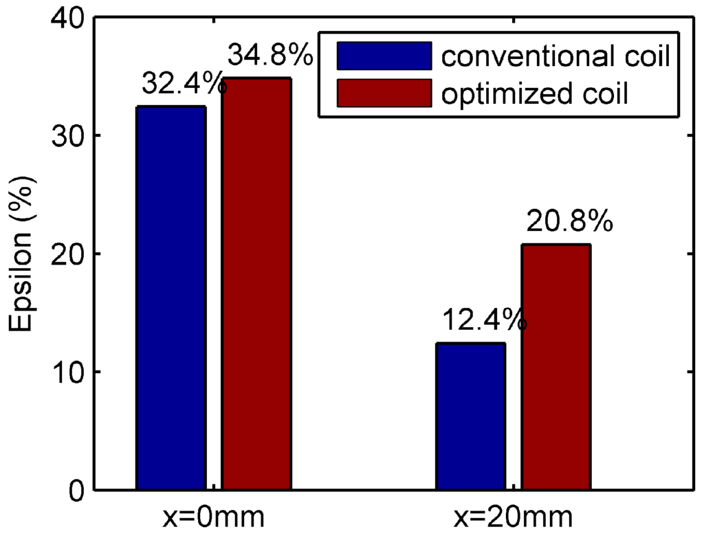 Experimental Results—Comparison of reduction in of the conventional coil and optimized coil for centered and off-center rivets.