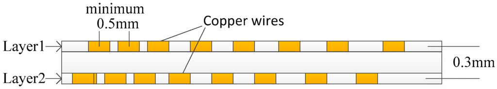 A prototype probe with the optimized coil is fabricated and instrumented to test the performance of the proposed design. The multi-layer coil is fabricated using a multi-layers print circuit board (PCB). A novel coil design, named multi-layer coils (MLC), is proposed to fabricate the optimized coil. Each coil consists of at least two layers. Coppers from different layers stagger to cover the air gaps, as shown in Figure 12, so that the current distribution is more continuous in comparison with that of a single layer coil.