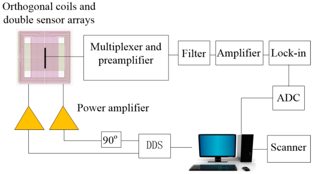 The experimental system is shown schematically in Figure 13a. GMR Sensor Model GF708 from Sensitec (Lahnau-Waldgirmes, Germany) is used to build the prototype. A linear sensor array with 32 sensors is used. The distance between two sensors is 1.6 mm. The normal component of the magnetic flux density is measured by the array sensors. The sensor array is located on the symmetry plane of the x-direction coil, 1 mm above the coil.