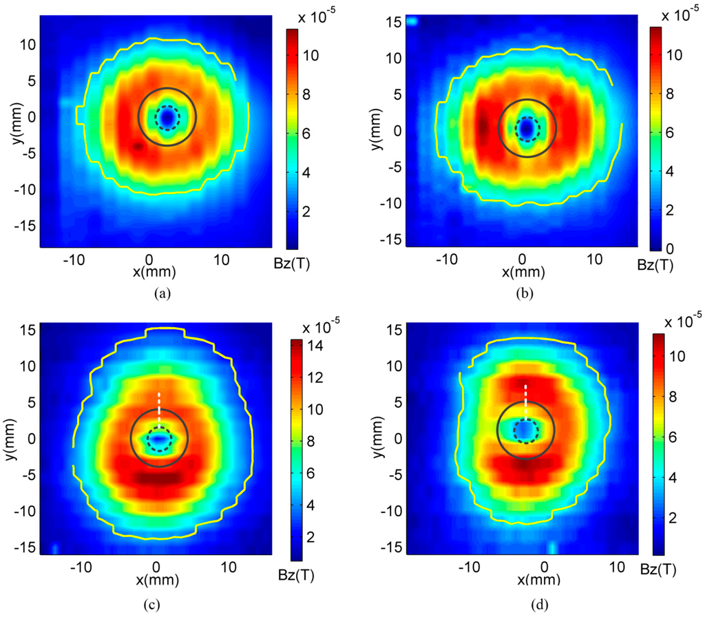 A sinusoidal current of amplitude 150 mA and frequency 100 Hz is applied to the two orthogonal coils with a 90° phase difference. A lock-in amplifier model RF840 from Stanford Research System is used to obtain the baseband signal with the best possible signal to noise ratio (SNR). The output of the lock-in amplifier is sampled and stored. The experimental measurements are obtained using a high resolution scanning system.