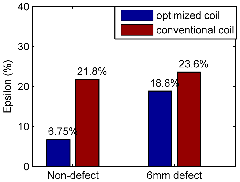 The deformation coefficient defined in Equation (25) is calculated to quantify the performance, as shown in Figure 15. For optimized coil, is 6.75% for the defect free rivet and increases to 18.8% for the rivet with a 6 mm length defect. However, for the conventional coil, changes from 21.8% to 23.6% for the defect free and defective rivet. The optimized coil has better defect detection capability compared with the conventional coil.