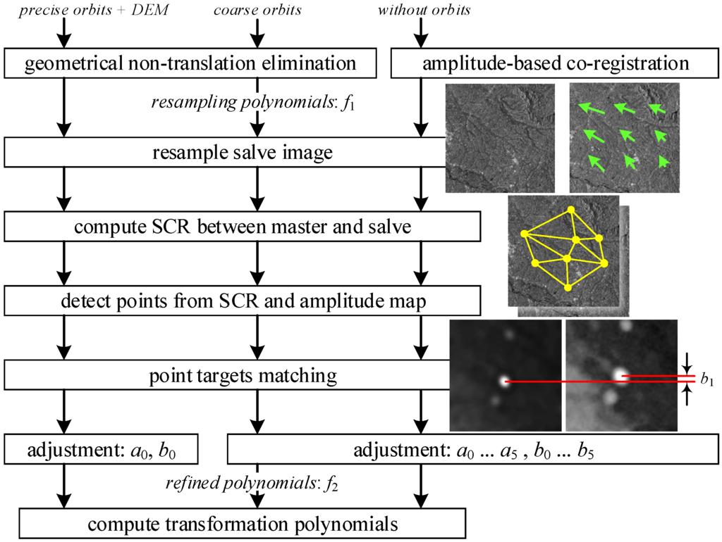 For image pairs with precise orbits, we calculate the offsets pixel by pixel according to the orbital information and related DEM information, and obtain the transformation relationship between images. In this case, the co-registration error is mainly induced by clock drifts of the SAR satellite, which is usually modelled as a constant shift [10,11]. In the following steps, the low-frequency system error will be removed with point targets [12,13].