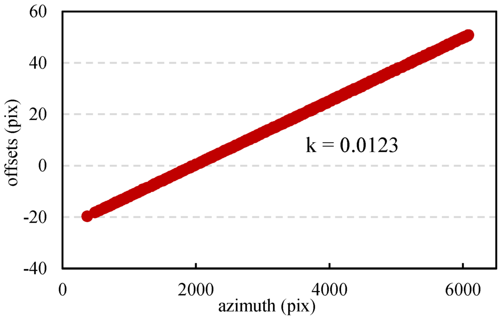 The orbits intersection angle of the test images is about 6.91 × 10−6 rad, resulting in an angle of 0.157 rad in the azimuth. This angle makes the offset estimates vary along the azimuth at a rate of 0.0123, shown in Figure 5. This rate means that the ambiguity of offset estimates in the azimuth of the patch reaches as high as 0.8 pixel, which will influence the accuracy of final co-registration.