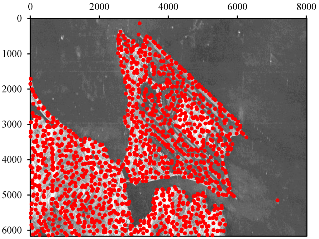 For the proposed method, the images were co-registered using orbital information, and a series of points were detected with the SCR and amplitude threshold after primary co-registration. On the premise that the point density is comparable to that used in the standard method, we got 1326 registration points, as is shown in Figure 6. The computational cost of our method is as low as about 43% of that of the standard method. This is attributed to the points detection strategy adopted in this paper, which avoids most water areas in the image.