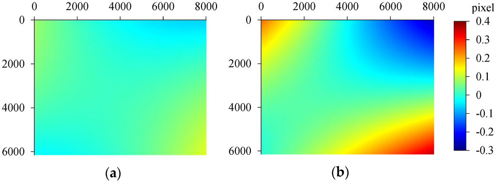 By the standard method, the RMSE values of the quadratic polynomial fitting in azimuth and range are up to 0.064 and 0.269, respectively. However, those values are only 0.029 and 0.051, respectively, with our method which is superior to the standard method. Figure 7 shows the difference of the polynomials using two methods. Obviously, the maximum difference in azimuth exceeds 0.35 pixel.