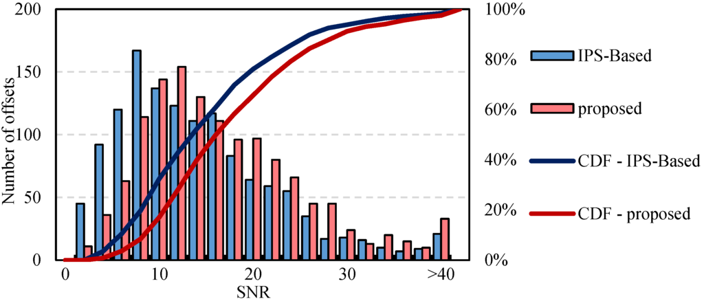 In Figure 8, the histogram and the cumulative distribution function (CDF) of SNR values are displayed. The SNR values after non-translation elimination are higher than those with non-translation. Then, the polynomials were fitted using the offsets. An iterative least square method was applied to remove the deviation of the offset measurements away from their initial polynomial fit. The residues of the rest offsets in range and azimuth were then calculated, as is shown in Figure 9. For the offset residues in range, similar results were obtained by the two methods. The proposed method achieved a RMSE of 0.0294, a bit smaller than the 0.0430 obtained by the IPS-Based method. While as to the offset residues in azimuth, the residues of the IPS-Based method are very unstable and their RMSE (0.2019) is much greater than the 0.0512 of the proposed method. The analysis of both SNR and residues of offsets in range and azimuth indicates the significant influences of non-translation on the estimation of offsets.