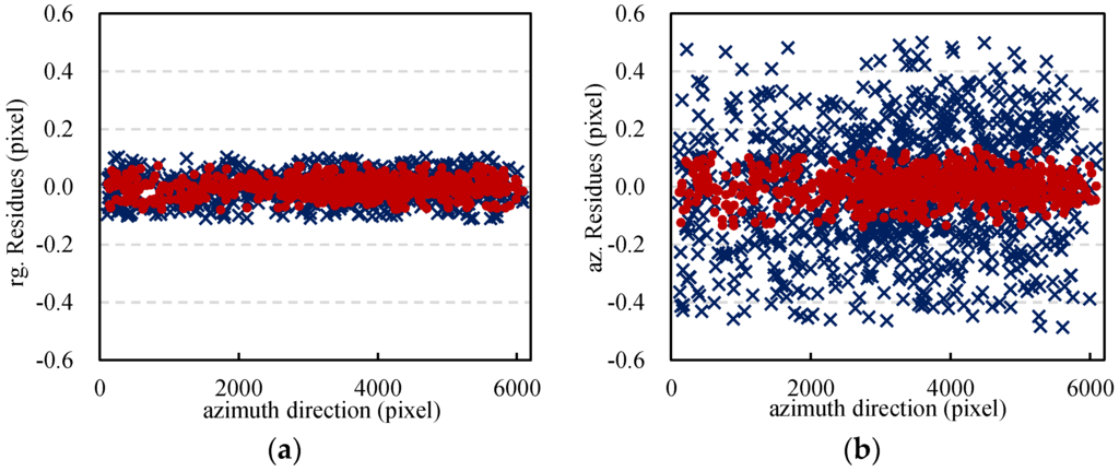 Residues of the offsets in range (a) and azimuth (b) by the isolated point scatterers (IPS)-Based method and the proposed method. The blue crosses and red points refer to the residues of the offset estimates before and after non-translation elimination.