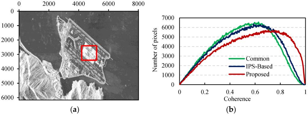The coherence of interferograms is a vital element to evaluate the performance of co-registration [7]. Three interferograms were developed by resampling the slave using the polynomials acquired with the three methods above. To reduce the uncertainties in statistics, a 1000 × 1000 pixel land region containing a large water area was cut out from the original image. The selected region mainly includes buildings, runways, and sand inside the airport, as the red square in Figure 10a shows. We estimated the interferometric coherence from the three interferograms using a Gaussian weighting function. Three developed coherence maps are shown in Figure 11. Figure 10b is the coherence histograms of the three methods. The coherence of the IPS-Based method is slightly higher than that of the standard method, and the proposed method has the highest coherence. The average coherence values of the standard method, IPS-Based method, and our method are 0.509, 0.527 and 0.576, respectively.