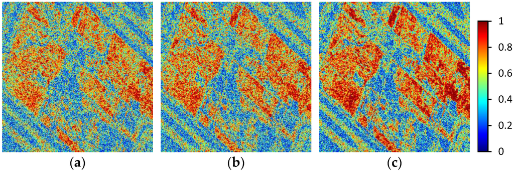 Coherence maps generated by the three methods: (a) the standard method; (b) the IPS-Based method; (c) the proposed method.