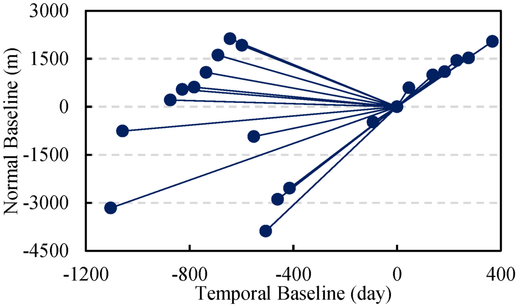 About 32.5 km long, the Donghai Bridge starts from Pudong in Shanghai and ends in Hangzhou Bay. We collected 21 PALSAR images covering the bridge, as the two images in Figure 2 show. The test data span a time duration from January 2007 to January 2011. To ensure a relatively small overall baseline, the data collected on 15 January 2010 were selected as the master and the other data were co-registered to it. The distribution diagram of the normal and temporal baselines of the dataset is shown in Figure 12.