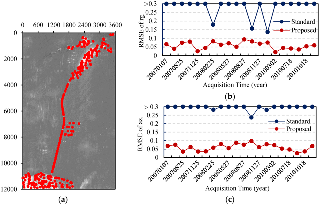Co-registration results for the Donghai Bridge. (a) Distribution of the detected registration points; (b) RMSE values of the offset estimates in range; (c) RMSE values of the offset estimates in azimuth obtained by both the standard method and the proposed method.