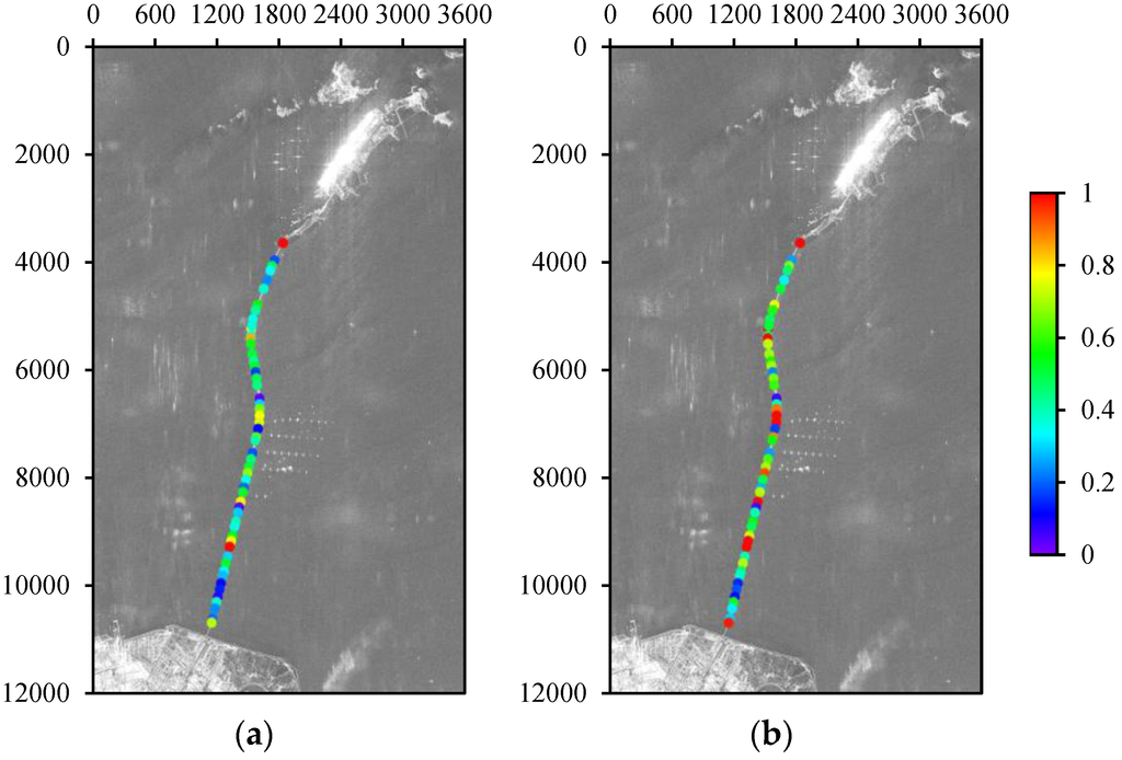 To further verify the functions of the non-translation elimination in co-registration, comparison experiments were performed between the proposed method and the method in literature [14]. Serafino adopted isolated point scatterers (IPS) to do co-registration, which is similar to the strategy based on registration points. However, they did not discuss the non-translation elimination process prior to it. For simplicity, the method based on isolated point scatterers is referred to as the IPS-Based method hereafter. In this method, the point targets are detected using a 2-D sinc function template. The distribution of obtained registration points are too dense, and some points are even on the water area. For better comparison and analysis, we performed the IPS-Based method with the registration points detected by the proposed method.