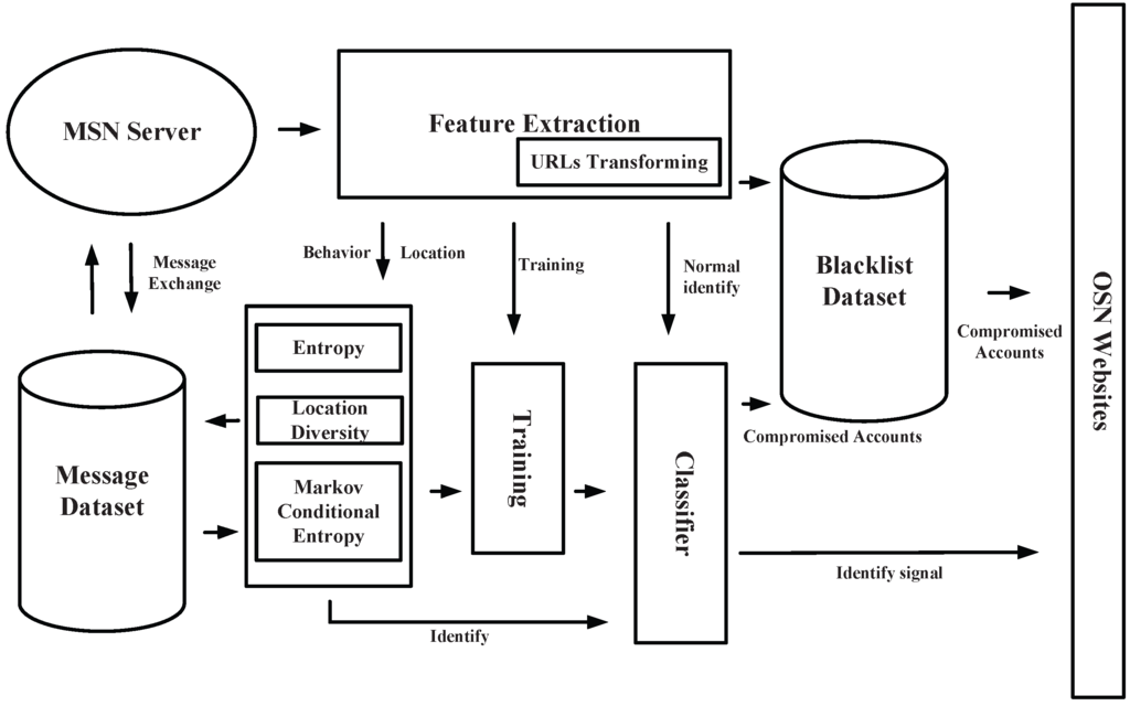 Feature Extraction: This part is the first to be encountered when a message stream comes from an MSN server. In this part, we utilize multi-process and the Sina Weibo API to extract the basic features that we need to handle. As features in our solutions are not simple, we need to calculate these basic features in the next few parts. Features about behavior will be sent to entropy parts, which can calculate the value of entropy and conditional entropy based on a Markov model. Accounts and URLs in messages will first be sent to the Blacklist Dataset.