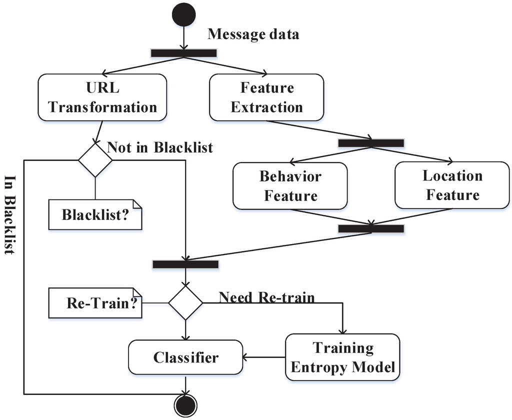 In this section, we plan to introduce every part of our detection system in detail on mobile social networks. We built a detection system based on machine learning strategies, which can be viewed in Figure 1. This system has mainly about seven parts. We have also drawn a figure of the unified modeling language (UML) activity (Figure 2) with our method that would help understand the inner flow of message data. The flow of data in the models is similar to that of other systems that are based on machine learning strategies. However, we include our own elements of the behavior-based features and plan to introduce these elements into the system one by one.
