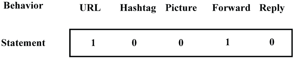 Entropy: This item is the typical one to measure the confusion degree of statistics. We have introduced it to present the behavior diversity when sending messages on mobile social networks. The bigger this value, the more diverse the behavior. In order to calculate this value, we need to make it clear which category the message falls into. We choose five items: URL, Picture, Hashtag, Forward, and Reply. We take a five-bit integer to represent the category of each message, which can be seen in Figure 3, and every bit matches with the corresponding item. If the message sent contains any behavioral item, the corresponding bit of it will be set to 1, otherwise, it will remain at 0 at the initial stage. Then, the category of all messages sent can be seen in this integer. We calculate the entropy of a user’s behavior based on Formula (1), in which represents the probability of messages belonging to category i: