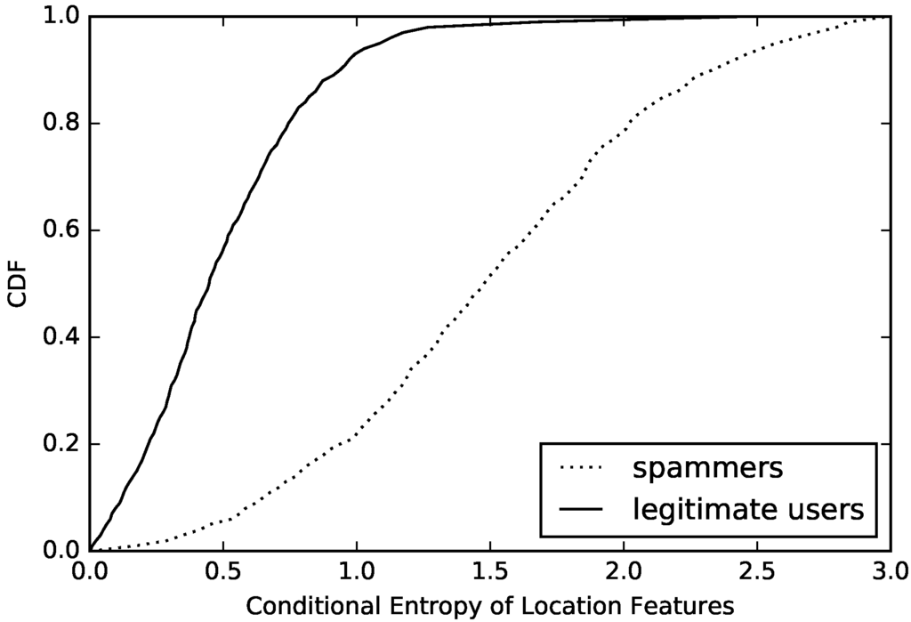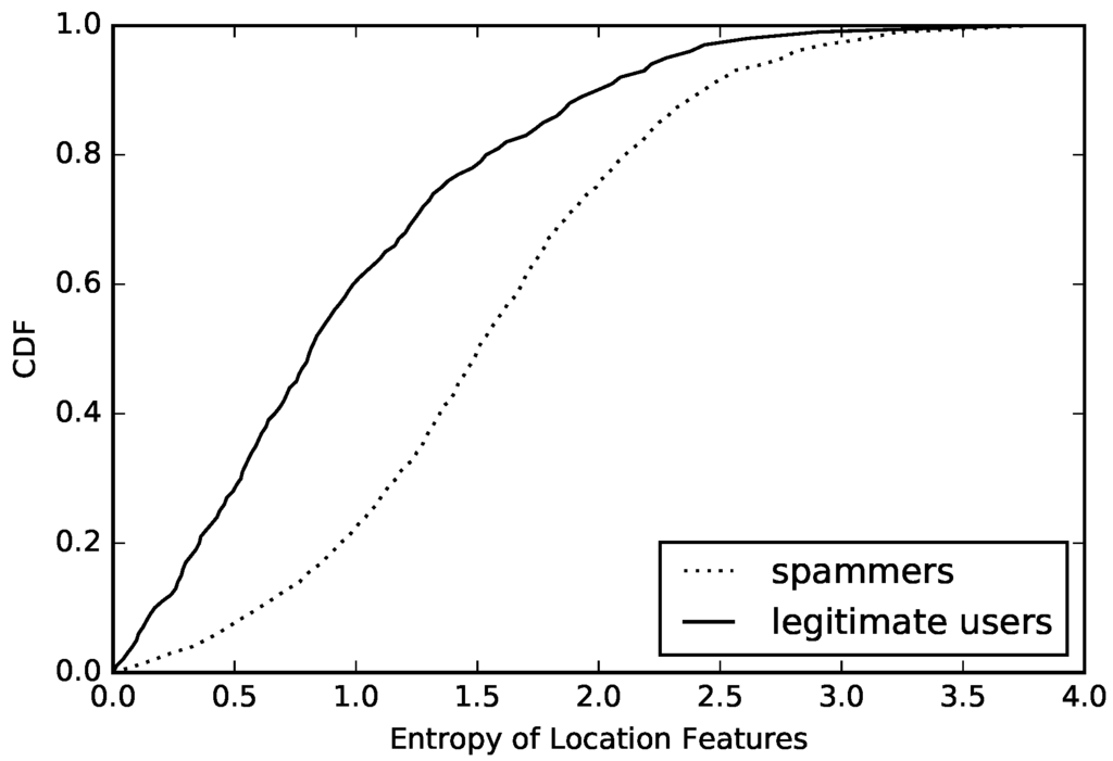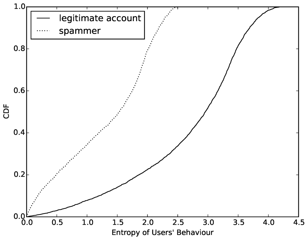 According to Formula (1), we calculate the value of entropy of normal accounts and compromised accounts. Then, we count the number of different values and draw a cumulative distribution function (CDF), which can be seen in Figure 4. Observing this figure, we determine that the value of entropy based on behavior can easily distinguish compromised ones from normal accounts. First, more than 65% of normal accounts have a value higher than 2.5. However, the entropy value of compromised ones are almost always lower than 2.5. This is an obvious threshold in entropy between compromised and normal accounts. Furthermore, about 22% of normal accounts have an entropy value lower than 2.0. We try to find out the reasons for this phenomenon and find that most of them are sent by cyborg and most of them have the same behavior model when sending messages. Finally, we also find that more than half of the compromised accounts have an entropy value between 1.5 and 2.5. After analyzing the samples whose entropy values are in this interval, we find that most of these compromised accounts are trying to change their behavior model periodically in order to evade detection.