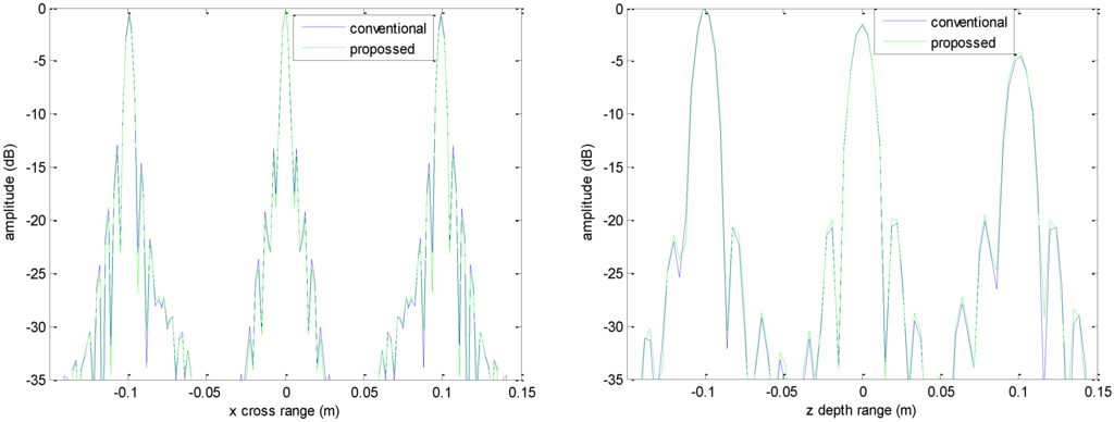 y = 0 m with a dynamic range of −30~0 dB, where the conventional method has visibly stronger clutter compared to the proposed method. Furthermore, it can be seen that for both methods, there is clutter distributed around the imaged scatterers, and the clutter is heavier when the