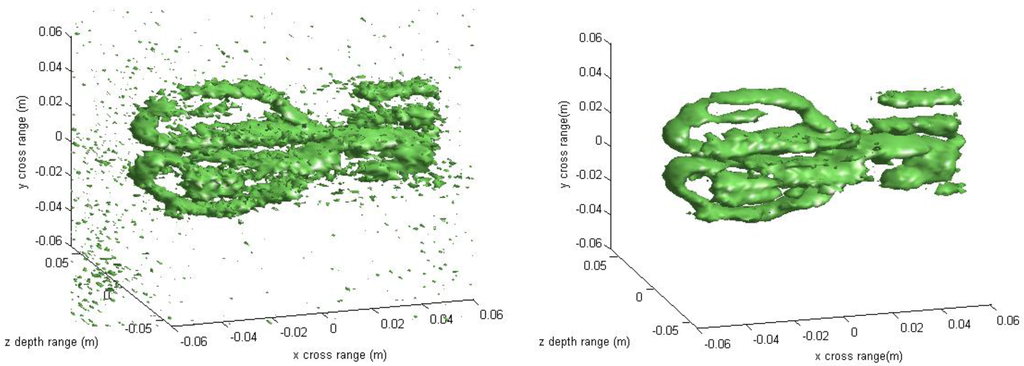 Figure 6 is the reconstructed 3-D image, where a dynamic range of −20~0 dB is used to provide a good view.