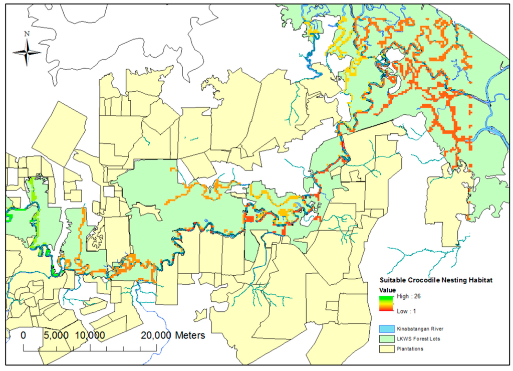 The crocodile population of the LKWS has endured fluctuations in both extent and stability; the current population size has, however, raised human-conflict concerns, with at least six anecdotal fatalities having occurred within the study area since 2010. The mapping of nesting habitats has a role in the mediation of conflict zones, especially if a further reduction in forest habitat results in a closer nesting proximity to human settlement. The identification of nests on an annual basis can also aid in the mapping of population trends. This, coupled with spotlighting surveys, could give a better indication of how the population is adapting to anthropogenic expansion. Nesting surveys of this nature could also provide estimates of the carrying capacity of both the study site and the LKWS as a whole, and how crocodile numbers could alter as forest conversion continues. An increase in sample size provided by annual nesting surveys would allow not only for a more in-depth modelling of nesting areas but also a more stringent predictive modelling. In this way, areas deemed most important to successful nesting could be protected, an action, which, in turn, would provide mediation of human-conflict issues. The status of crocodile populations throughout Sabah is also unclear so long term monitoring of nesting habits could be used as an indicator of ongoing population health.