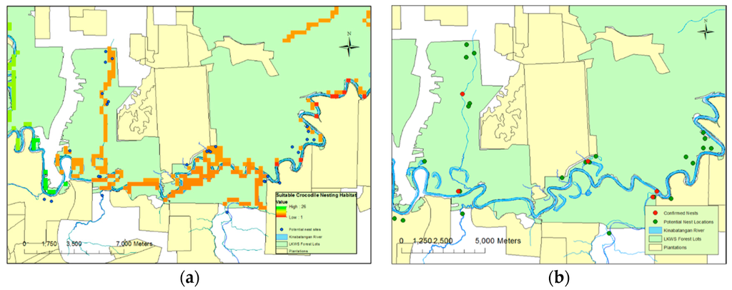 (a) Potential nest sites in relation to habitat suitability model; the majority of nests sites fell inside of, or close to, identified suitable areas within the study site. Suitability defined as areas of coloured pixels as in Figure 1, with potential nest sites overlaid as blue dots; (b) Locations of confirmed nest sites showing close proximity to water, as well as, on three occasions, close proximity to oil palm plantations.