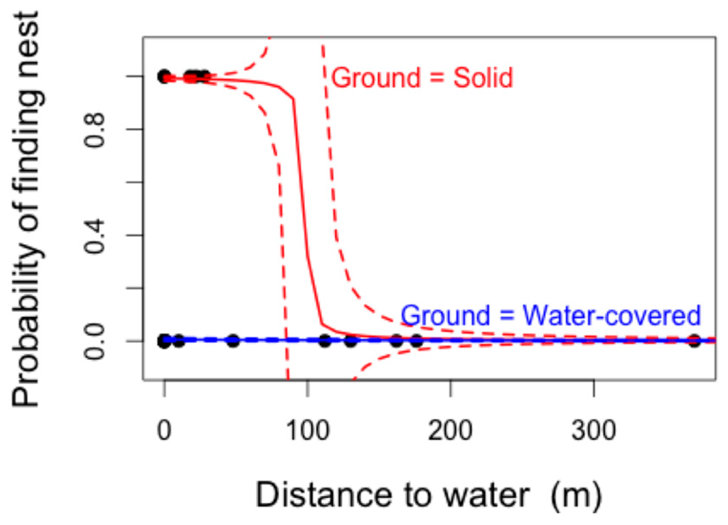Predictions based on this model suggested that whilst locations of nests in standing water could not be easily predicted, nests on solid ground were very likely to be less than 100 m away from permanent water sources (Figure 2b). In reality, these predictions are in line with those used during the original “fuzzy overlay” modelling (Figure 2a). An increase in sample size could lead to a refinement of solid-ground predictions and lead to more stringent standing water predictive sampling.