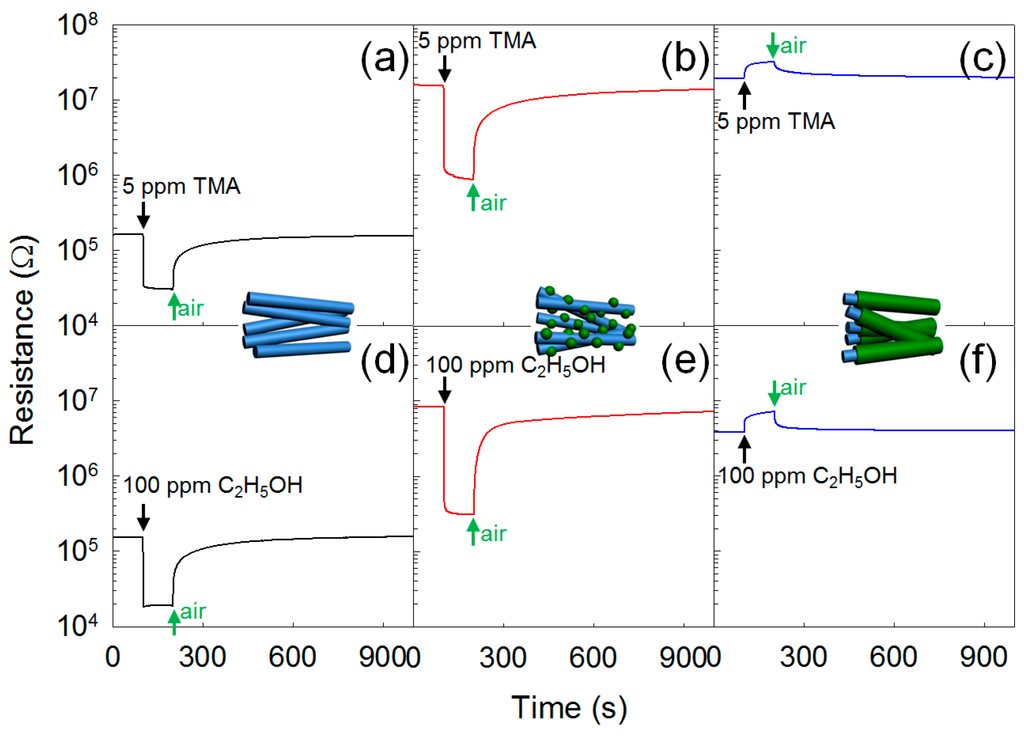 Dynamic sensing transients of (a) ZnO NWs; (b) Cr2O3-decorated ZnO NWs; and (c) ZnO-Cr2O3 core-shell nanocalbes (NCs) to 5 ppm trimethylamine (TMA) at 400 °C. Dynamic sensing transients of (d) ZnO NWs; (e) Mn3O4-decorated ZnO NWs; and (f) ZnO-ZnMn2O4 core–shell NCs to 100 ppm C2H5OH at 400 °C. Adapted from [,] with permission; (a–c) [] Copyright (2012) IOP Publishing Ltd.; (d–f) [] Copyright (2012) American Chemical Society.