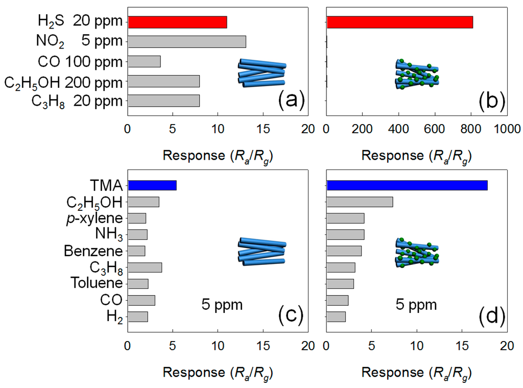 It should be noted that transition metal oxides such as Co3O4, Mn3O4, Cr2O3, NiO, and CuO are p-type oxide semiconductors. The decoration of discrete p-type metal oxide nanoclusters on n-type oxide semiconductor NWs provides various pathways to tailor their gas-sensing characteristics. Some examples of n-type oxide NWs decorated with different p-type oxide semiconductor nanoclusters are shown in Figure 2 [,,,,]. Nanoscale p-n junctions are formed, which cause the expansion of the electron depletion layer in n-type NWs beneath the p-type nanoclusters (Figure 2a). This increases the resistance in air (Ra) and makes the sensor more sensitive to the injection of charges by the gas-sensing reaction, enabling a larger chemiresistive variation (Figure 3a,b,d,e) [,]. Thus, the response of oxide NW-based gas sensors can be significantly enhanced without thinning the diameter of the oxide NWs down to twice the thickness of the electron depletion layer. This has a practical meaning because the preparation of oxide NWs thinner than ~20 nm is a relatively difficult task. In addition, the gas selectivity can also be controlled when the decorated materials show high catalytic activity towards a specific gas. For example, the decoration of CuO on SnO2 NWs dramatically enhances the selectivity to H2S [] (Figure 4a,b). This can be explained by the transformation of resistive CuO-SnO2 p-n junctions into highly conducting CuS-SnO2 metal-n junctions upon exposure to H2S. The gas selectivity emanates from the high chemical affinity between CuO and H2S. The present authors [,] uniformly decorated Cr2O3 nanoparticles on the surface of CVD-grown ZnO (Figure 2b,c) and SnO2 NWs (Figure 2d) using the thermal evaporation of CrCl2 powder. The decoration of Cr2O3 both on ZnO (Figure 4c,d) and SnO2 NW sensors (not shown) significantly enhanced the selectivity to trimethylamine (TMA). Cr and Cr2O3 are known for their unique methylamine selective adsorption and dissociation characteristics through bonding with the nitrogen lone pair electrons []. Since TMA has similar structure and chemical properties to methylamine, the response to TMA gas could be greatly improved by decorating the surface of metal oxide NWs with catalytic Cr2O3, enabling selective detection. By using the same synthetic method with different source powders, Co3O4-, NiO-, and Mn3O4-decorated ZnO NWs [,,] (Figure 2e–h) were also synthesized, showing the potential to tune the selectivity to NO2 and C2H5OH.